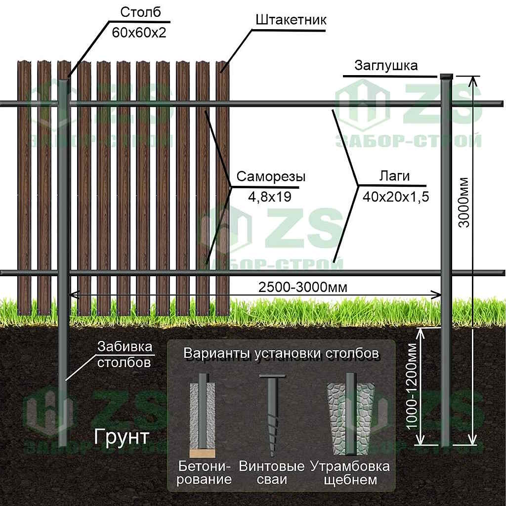 Самый недорогой способ монтажа, установка металлических столбов выполняется забивкой в грунт от 1,2 до 1,5 метра